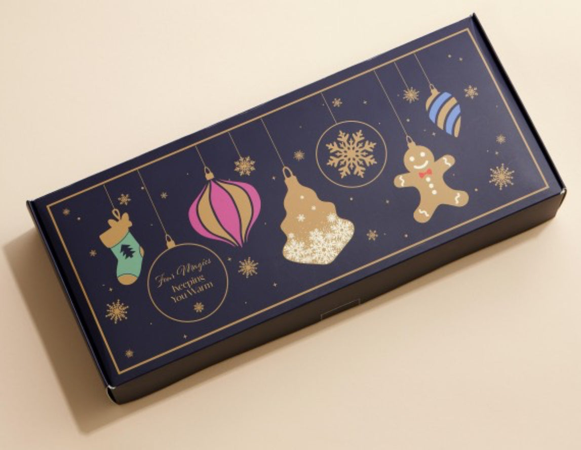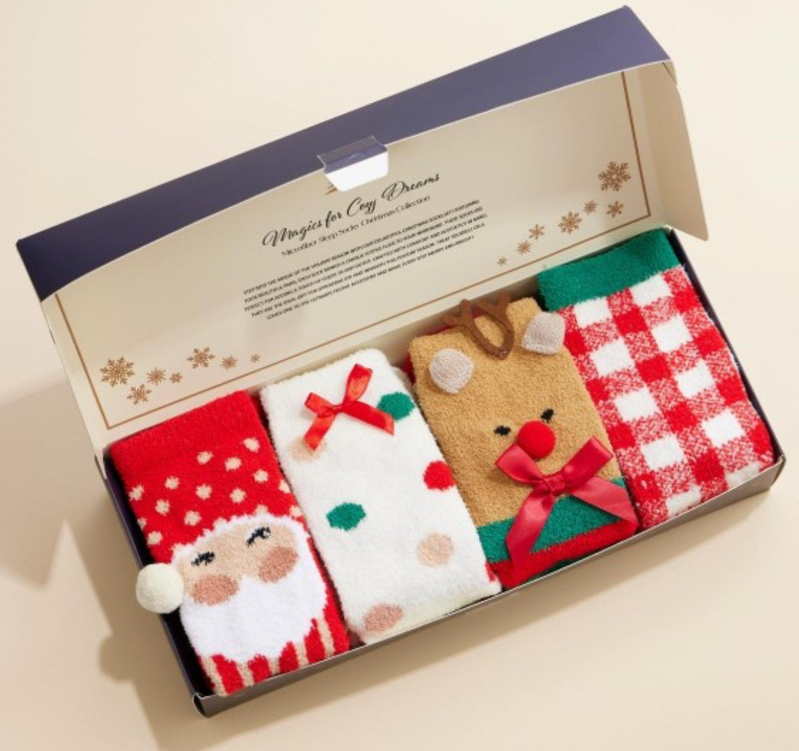 Various designs. Each gift box comes with 4 pairs of microfiber socks.