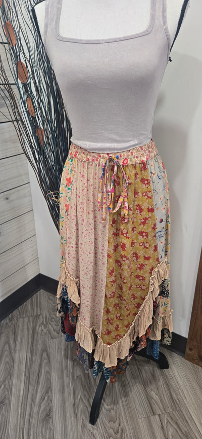 Colorful Contrast Patch Fabric Boho Asymmetrical Midi Skirt